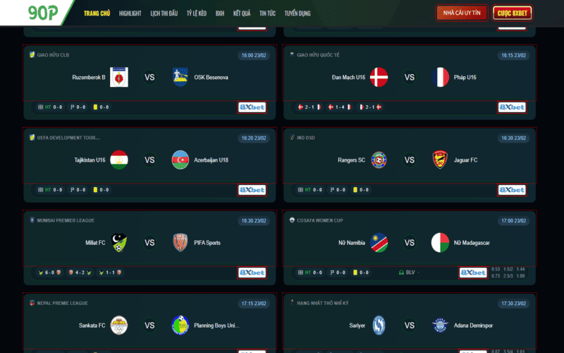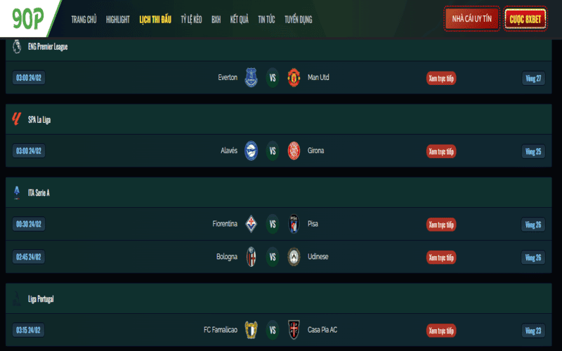 90P cập nhật lịch thi đấu 24/7 cho các giải đấu hàng đầu